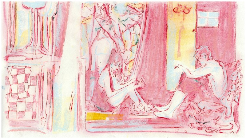 Historic evening. « on joue aux cartes au fond de l’étang » 03/11/2025. Inks, coloured pencil, A3 bristol paper (42x30cm).